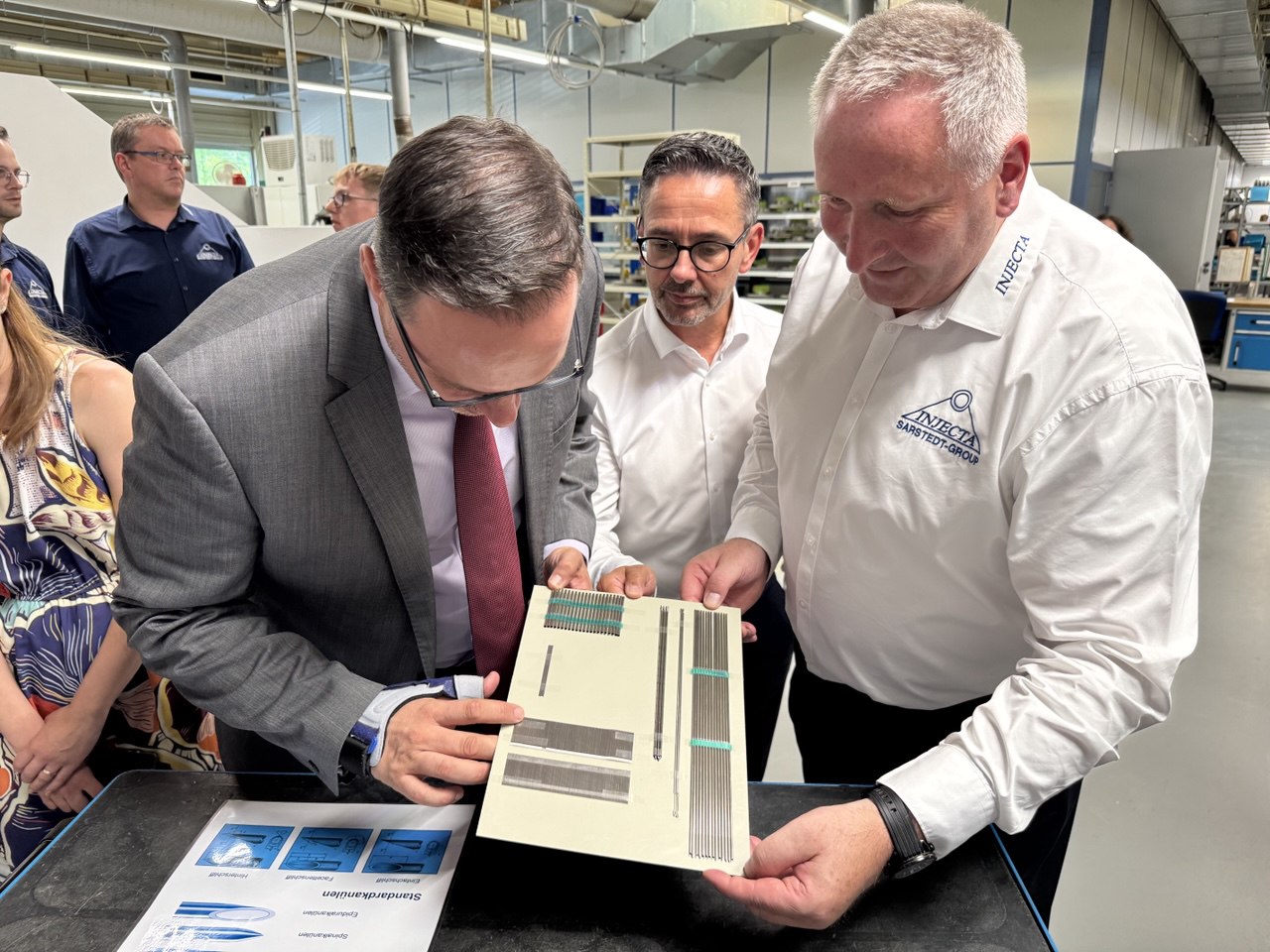 Die INJECTA GmbH stellt seit 1990 als Teil der SARSTEDT Gruppe hochpräzise Injektions- und Spezialkanülen für medizinische und technische Anwendungen her. Mit Investitionen in moderne Fertigungstechnik und gezielter Aus- und Weiterbildung bleibt das Unternehmen ein wichtiger Arbeitgeber in der Region. Themen im Austausch mit Geschäftsführer Frank Riemer-Keller waren aktuelle Investitionsprojekte, Marktchancen und Strategien zur Gewinnung junger Fachkräfte.