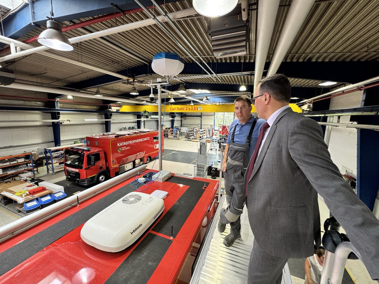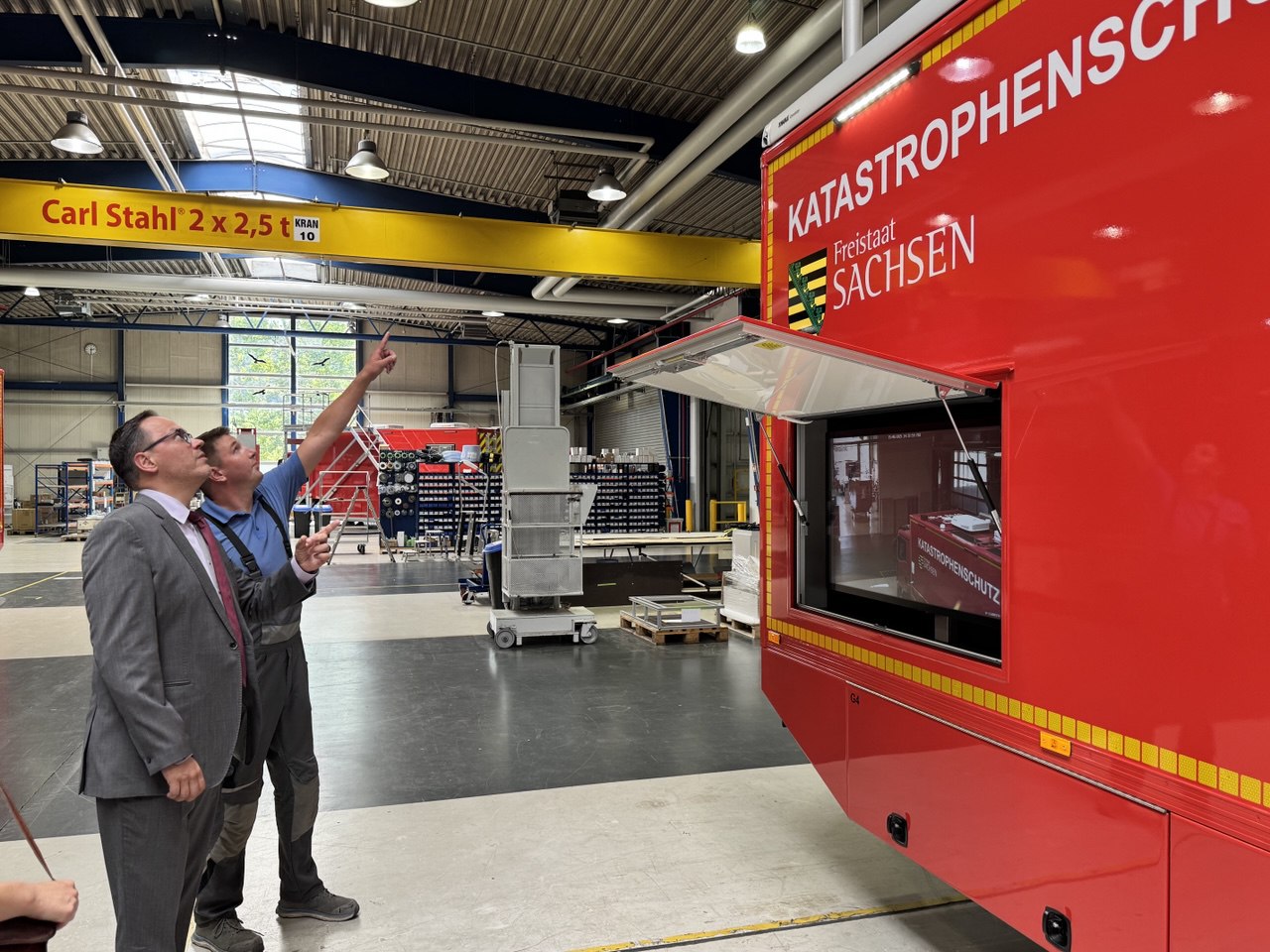 BINZ Automotive Sachsen GmbH übernahm 2021 den ehemaligen MAN-Standort in Plauen und produziert seither Spezialfahrzeuge für Rettungsdienste, Polizei und Bundeswehr. Aufgrund steigender Nachfrage wurde eine neue Produktionshalle eingerichtet. Geschäftsführer Carsten Bothmann präsentierte Minister Panter aktuelle Entwicklungen und Aufträge, darunter auch sogenannte »Dual-Use«-Projekte.