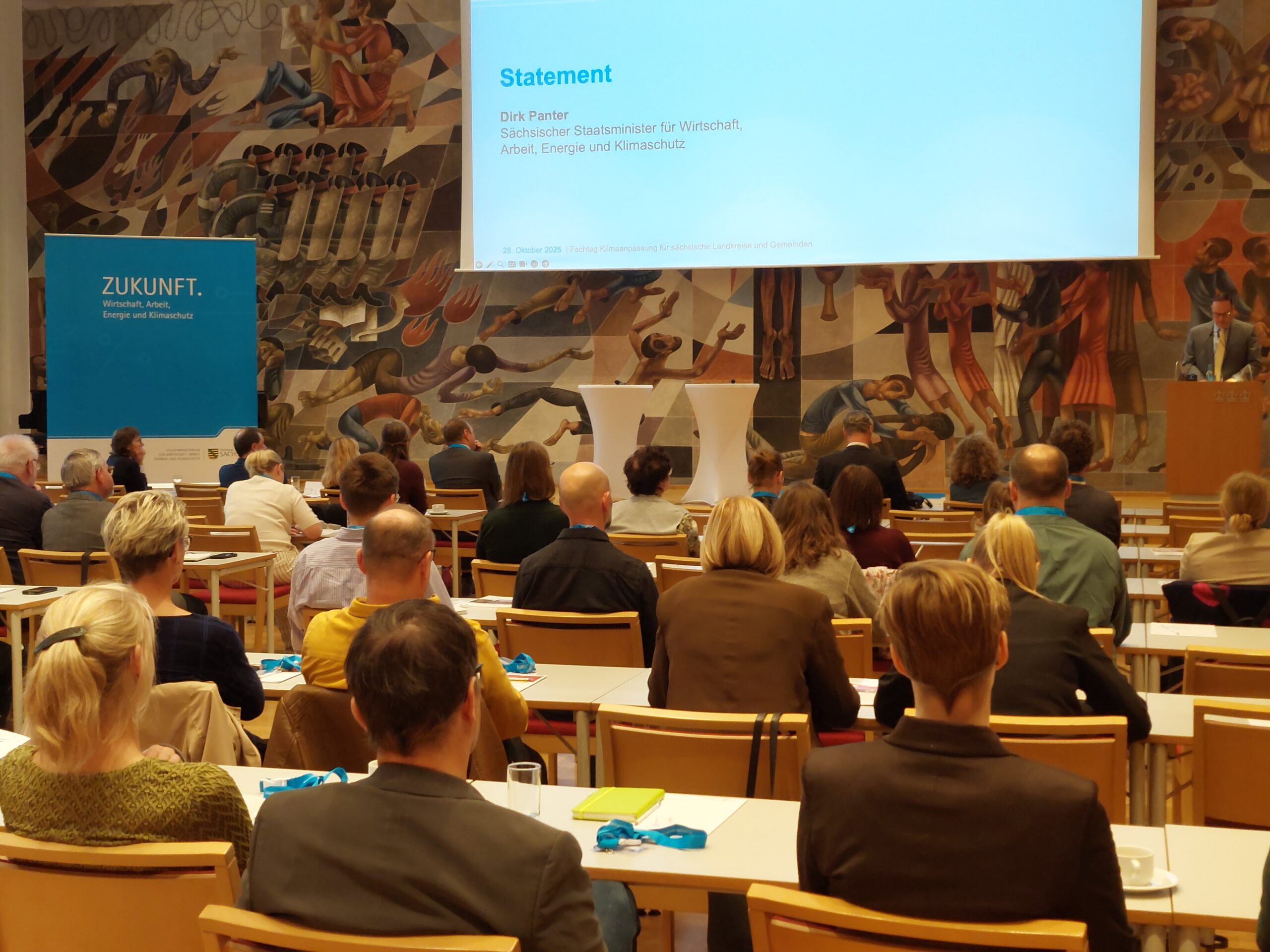 Mit dem Fachtag Klimaanpassung startet der Freistaat Sachsen den Beteiligungsprozess zur Erarbeitung einer eigenen Landesklimaanpassungsstrategie. Sie wird derzeit auf Grundlage von § 10 des Bundes-Klimaanpassungsgesetzes (KAnG) vorbereitet und soll Ende 2026 vorliegen. Sachsen erarbeitet die Landesstrategie gemeinsam mit Kommunen, Fachakteuren und der Öffentlichkeit. Bis zum 18. Januar 2026 können auch Sie im Beteiligungsportal zu Risiken, Bedarfen und möglichen Maßnahmen in den geplanten Handlungs- und Themenfeldern Stellung nehmen.